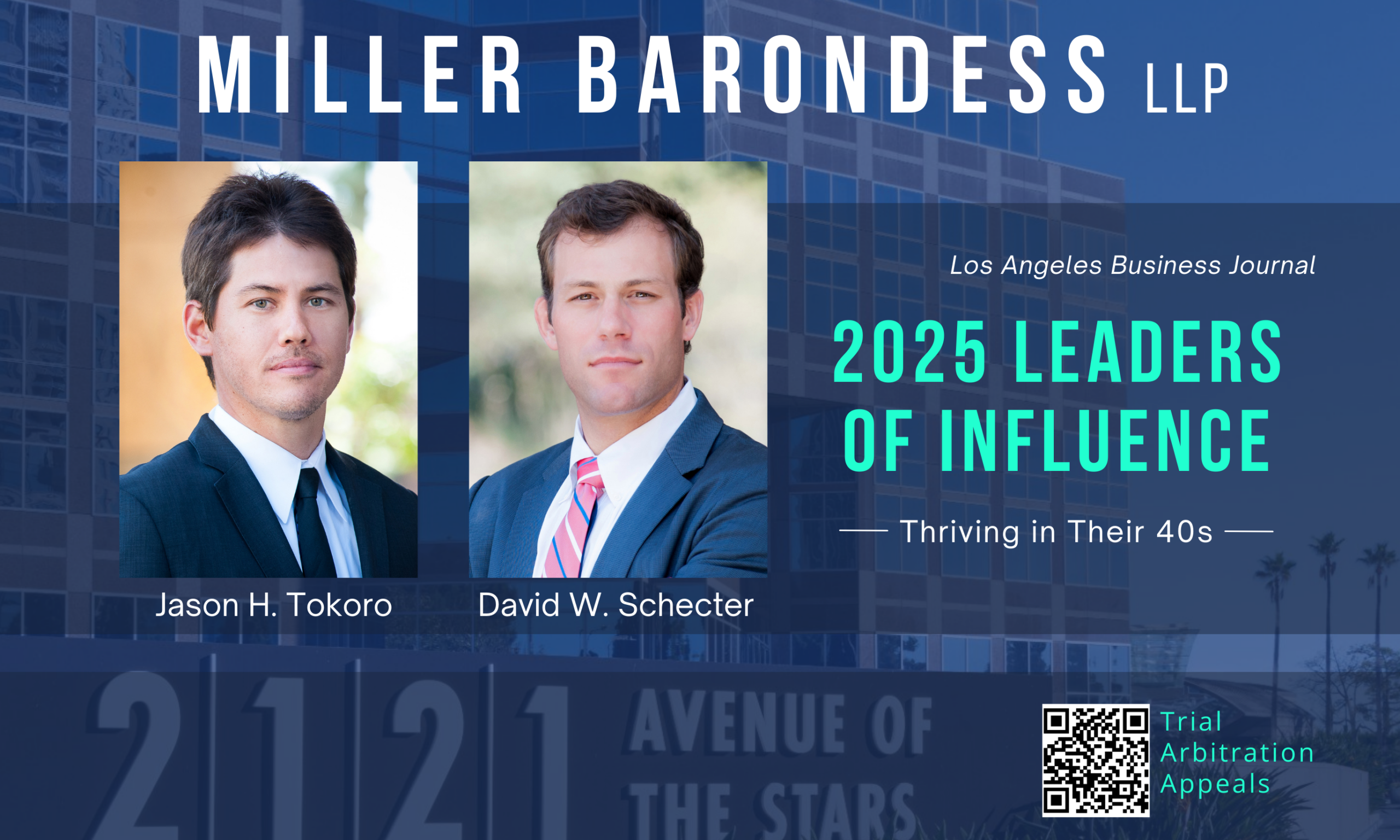 Partners Jason H. Tokoro and David W. Schecter have been recognized by the Los Angeles Business Journal on its 2025 list of the Leaders of Influence: Thriving in Their 40s. This special feature spotlights accomplished Los Angeles professionals in their 40s who demonstrate ongoing achievement in business and community leadership.